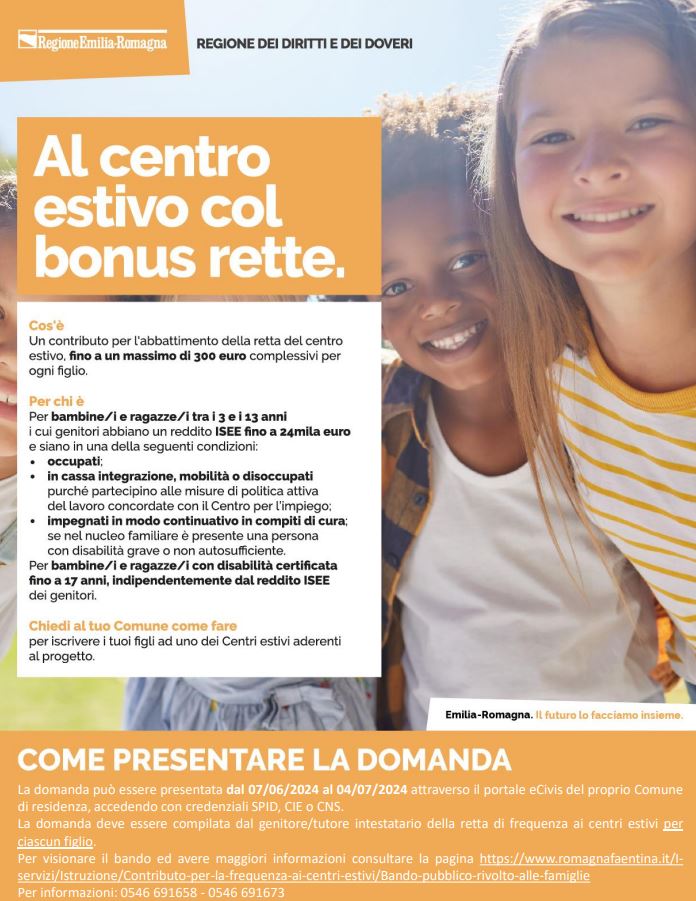 Con Determinazione dirigenziale della Giunta dell’Unione della Romagna Faentina n. 41 del 11.04.2024 è stato approvato l’avviso pubblico per la concessione di contributi alle famiglie con bambini/e e ragazze/i nella fascia di età compresa tra i 3 e i 13 anni e bambine/i e ragazze/i con disabilità certificata di età compresa tra i 3 e i 17 anni, per la frequenza ai Centri Estivi – Anno 2024.Potrà essere riconosciuto un contributo massimo di € 100 settimanali e complessivamente di € 300 per ciascun bambino/ragazzo residente in un Comune dell’Unione della Romagna Faentina, che frequenti Centri Estivi aderenti al Progetto ed appartenente ad un nucleo familiare: