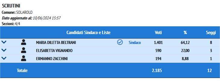 Nel nostro paese Maria Diletta Beltrani (Uniti per Solarolo) è la nuova sindaca con il 64,12% dei voti. Segue Elisabetta Vignando (Sì cambia Solarolo) con il 27% ed Ermanno Zacchini (Insieme Salviamo Solarolo) con l’8,88%.