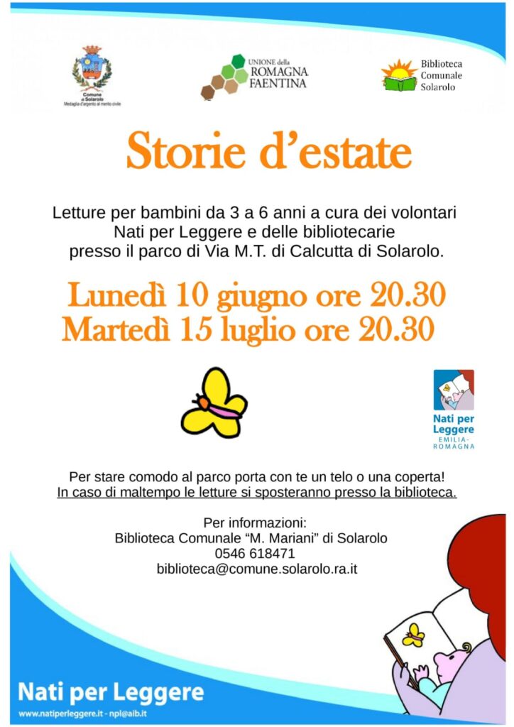 Letture per bambini da 3 a 6 anni a cura dei volontari Nati per leggere e delle bibliotecarie presso il parco di via M.T. Calcutta di Solarolo