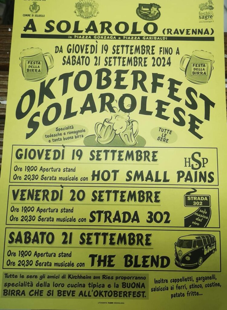 Tutte le sere gli amici di Kircheim am Ries proporrano specialità della loro cucina tipica e la buona birra che si beve all’oktoberfest. Inoltre stand con specialità romagnole.