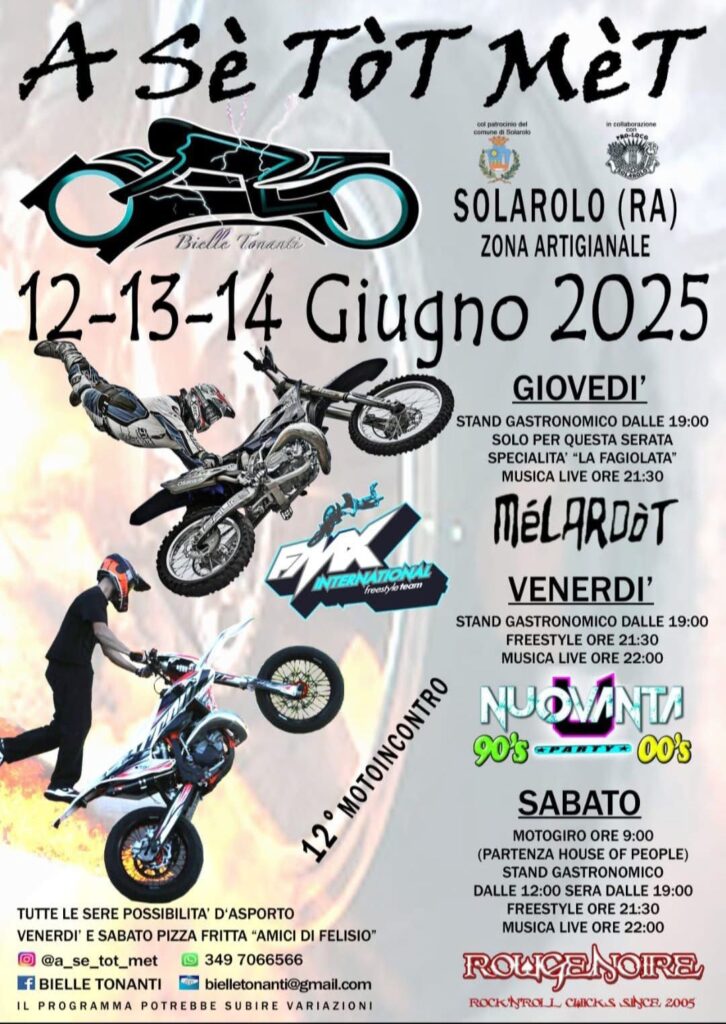 12/13/14 giugno 2025 a Solarolo nella zona artigianale. Stand gastronomico, esibizioni di moto, stuntman, freestyle, musica dal vivo. Programma della festa: