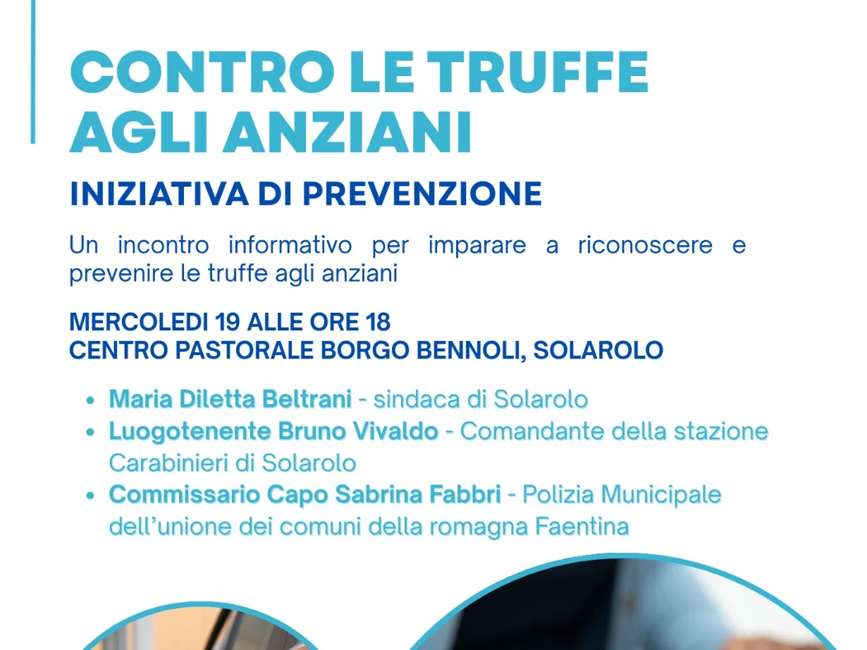 Durante l’incontro interverranno la sindaca di Solarolo Maria Diletta Beltrani, il comandante della stazione dei Carabinieri di Solarolo, luogotenente Bruno Vivaldo e Sabrina Fabbri, funzionaria della Polizia Locale dell’Unione della Romagna Faentina, che forniranno consigli pratici e indicazioni su come comportarsi in caso di tentativi di truffa.