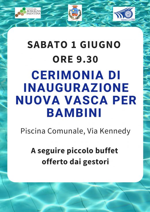 Sabato 1 giugno cerimonia di inaugurazione nuova vasca per i più piccoli. Ore 9.30, a seguire piccolo buffet offerto dai gestori.