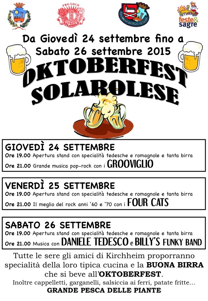 Da giovedì 24 settembre a sabato 26 settembre Tutti i giorni ore 19 apertura stand gastronomico con specialità tedesche e romagnole, e tanta birra Giovedì 24 h.21 – musica pop-rock con i Groviglio Venerdì 25Continue reading