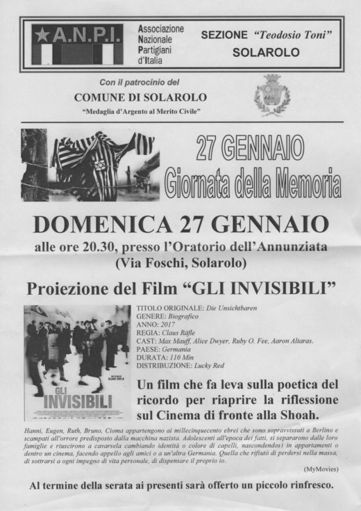 Ore 20.30, presso l’oratorio dell’Annunziata in via Foschi, proiezione del film “Gli invisibili”. Organizzato dall’A.N.P.I. (sez. Teodosio Toni), con il patrocinio del Comune. Al termine della serata verrà offerto un piccolo rinfresco